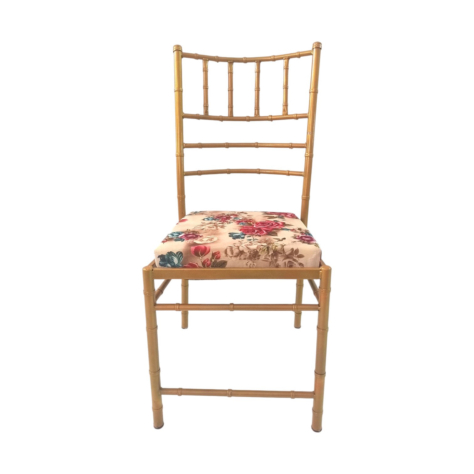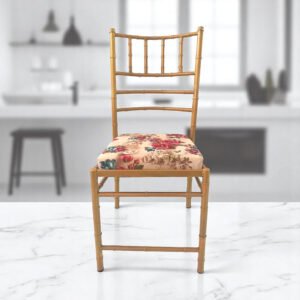 Elevate the ambiance of any special occasion with our exquisite Gold Chiavari Chair, featuring a charming floral cushion. This classic and sophisticated chair is the epitome of timeless elegance, making it an ideal choice for weddings, engagement parties, bridal showers, anniversaries, galas, and any event where style and comfort are paramount.
