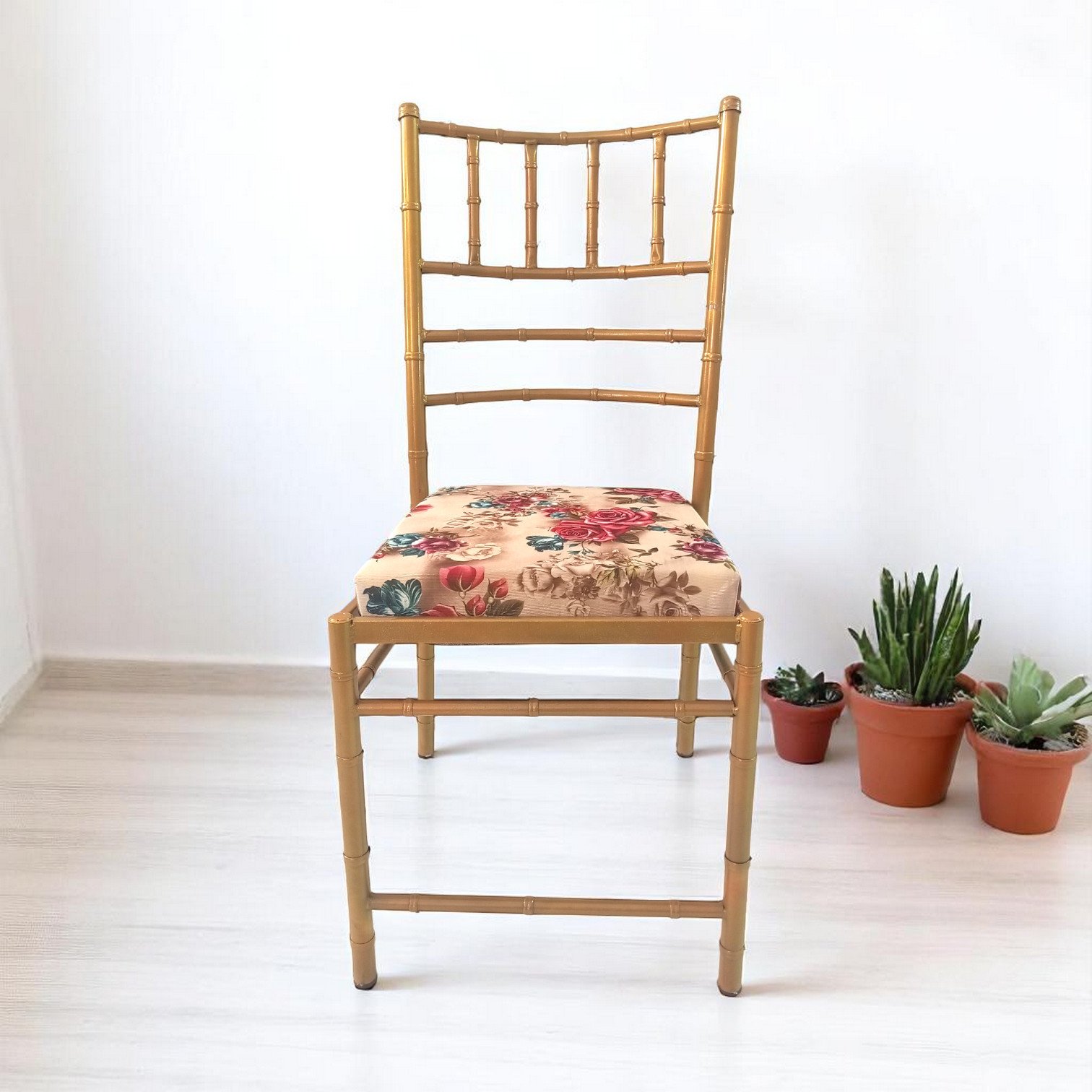 Imagine these stunning gold Chiavari chairs lining your wedding aisle, creating a majestic path for the bride, or gracing your reception tables, adding a touch of grandeur to your dining experience. The floral cushions can perfectly tie into garden themes, rustic chic decor, or add a pop of softness to more contemporary settings. They are not just chairs; they are a statement piece that enhances your overall event design, leaving a lasting impression on your guests.