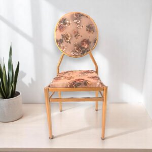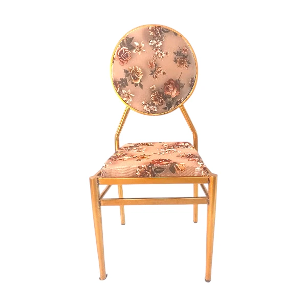 This is a stylish and elegant vintage-inspired accent chair perfect for adding a touch of classic charm to any space. The chair features a sturdy gold-tone metal frame that provides both durability and a glamorous aesthetic. Its distinctive circular backrest and comfortable square seat are upholstered in a beautiful floral fabric, showcasing a delicate pattern of roses in muted tones of pink, brown, and green on a neutral background.