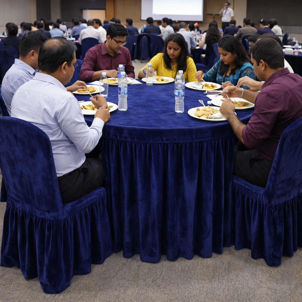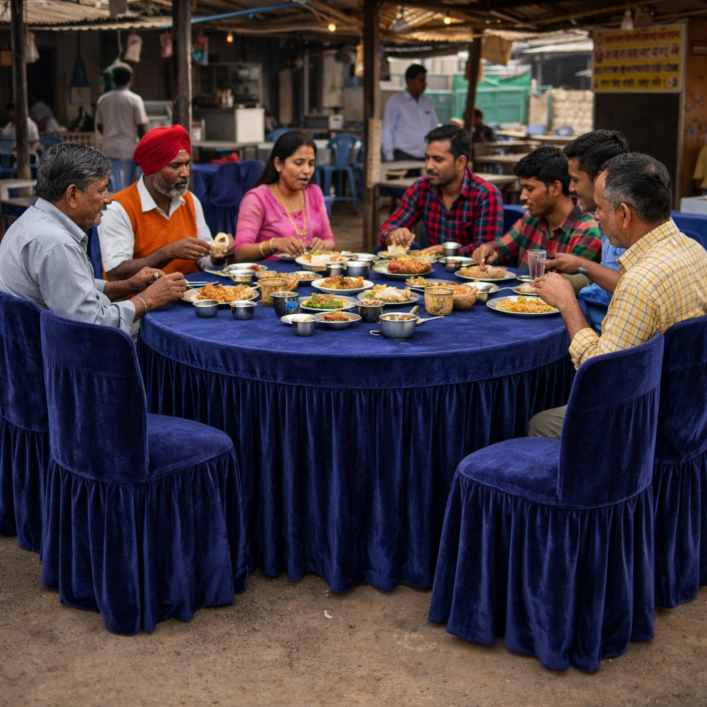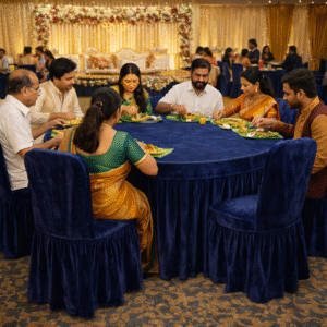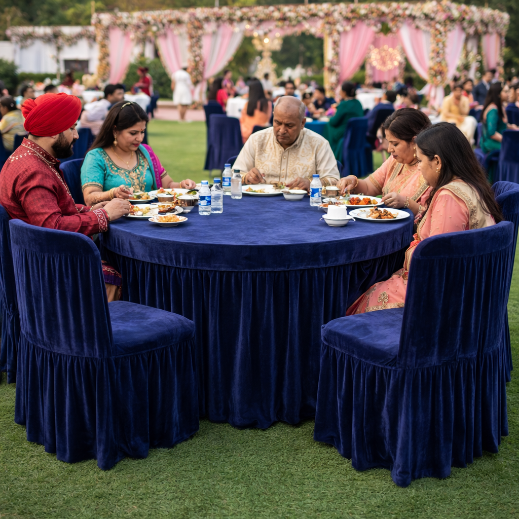 Give your setup a premium look with our 190 GSM velvet round table cover featuring a rich velvet top and a neatly stitched pleated skirt. Ideal for professional use in Hotels, Banquets, Weddings, Events, Dhaba, Restaurants and more.