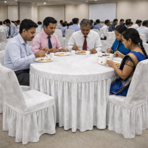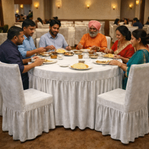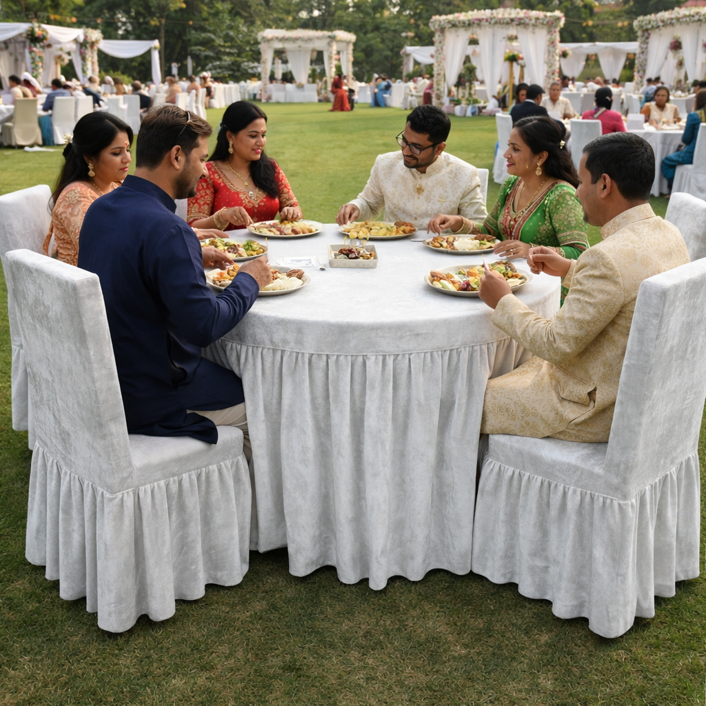 Give your setup a premium look with our 190 GSM velvet round table cover featuring a rich velvet top and a neatly stitched pleated skirt. Ideal for professional use in Hotels, Banquets, Weddings, Events, Dhaba, Restaurants and more.