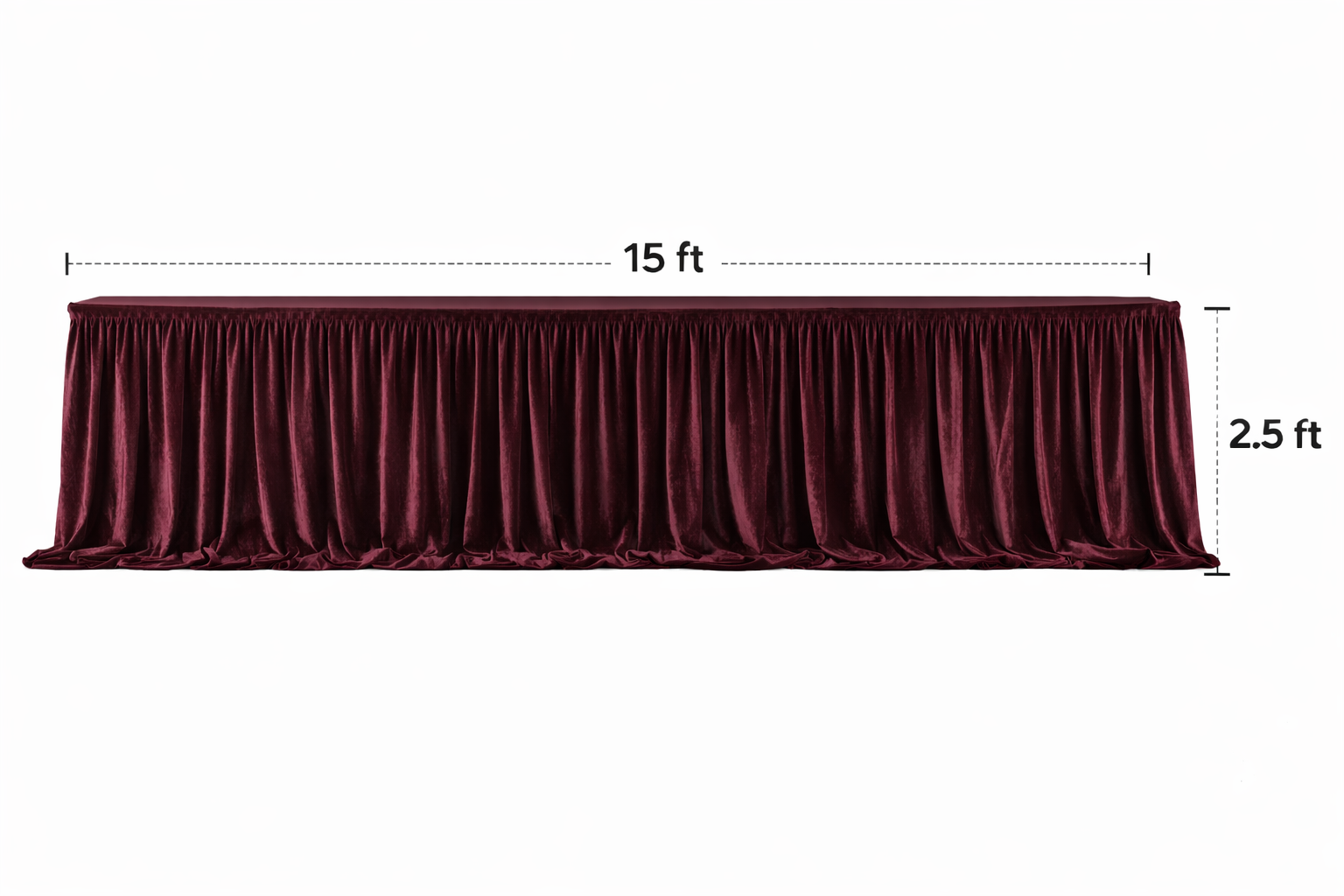 This 15ft long and 2.5ft height front velvet sider is specially stitched for professional event decoration use. The fabric gives a rich, soft mink velvet feel with heavy fall and elegant pleats.